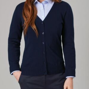 60% Cotton, 40% Acrylic 2 gauge knit. V-neck, ribbed placket, cuff and hem, contrast inner neck strip