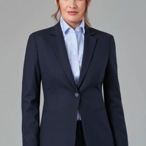 63% Polyester (30% Recycled), 34% Viscose, 3% LYCRA® Elastane. Tailored fit, 1 button, notch lapel, centre vent, twin outer welt pockets Centre back length at size 12R = 63cm